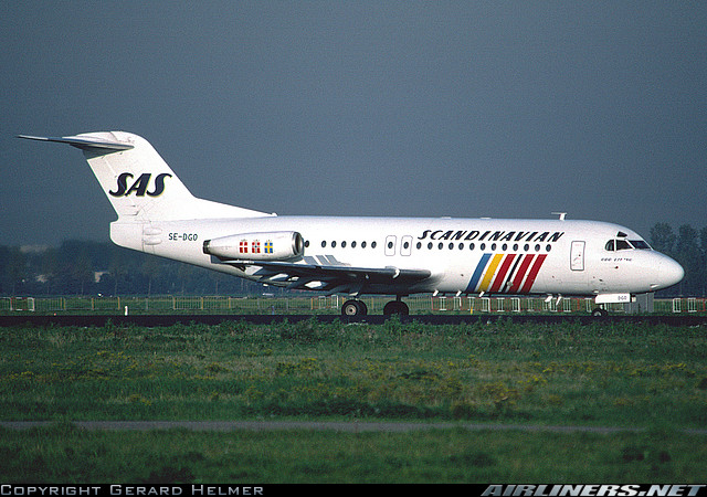Scandinavian Airlines Fokker F-28-4000, SE-DGO, is shown at Amsterdam in the mid-1990s.