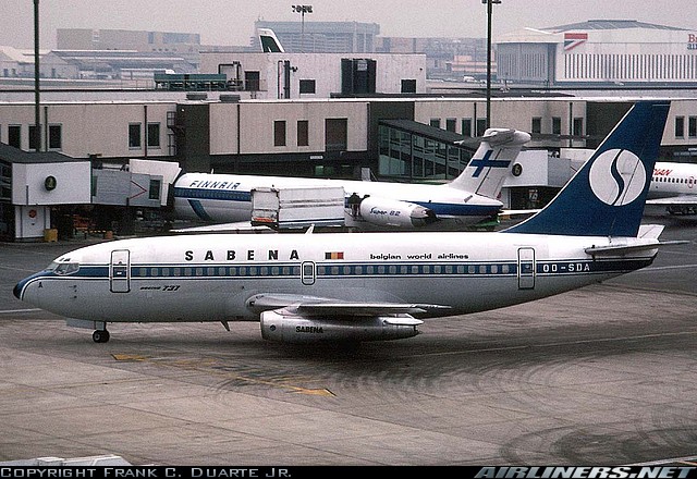 Sabena Boeing 737-229, OO-SDA, is shown at London Heathrow Airport in March 1986.