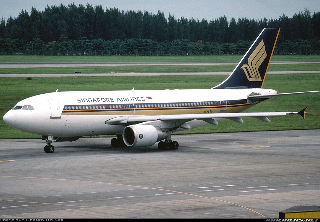 Singapore Airlines Airbus A310-324, 9V-STQ, is shown at Singapore on October 7, 1992.