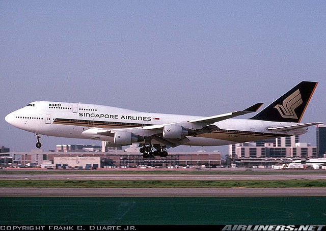 Singapore Airlines Boeing 747-412, 9V-SMD, is shown arriving at Los Angeles International Airport in November 1992.