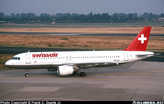 Swissair Airbus A320-214, HB-IJA, "Opfikon," is shown at Dusseldorf in January 1996.