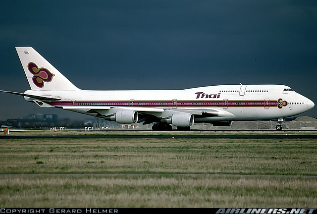Thai Airways International Boeing 747-4D7, HS-TGJ, is shown at Amsterdam in the mid-1990s.
