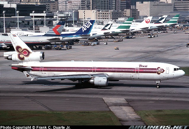 Thai Airways International McDonnell Douglas MD-11, HS-TMF, "Phichit," is shown at Hong Kong in October 1996.