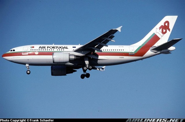 TAP Air Portugal Airbus A310-304, CS-TEI, is shown arriving at London Heathrow Airport in 1996.