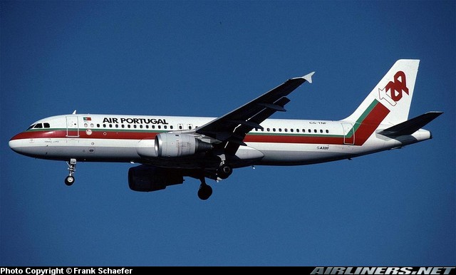 TAP Air Portugal Airbus A320-211, CS-TNF, is shown arriving at London Heathrow in 1996.
