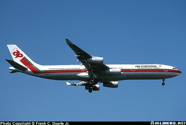 TAP Air Portugal Airbus A340-312, CS-TOA, "Fernao Mendes Pinto," is shown arriving in Frankfurt in January 1996.