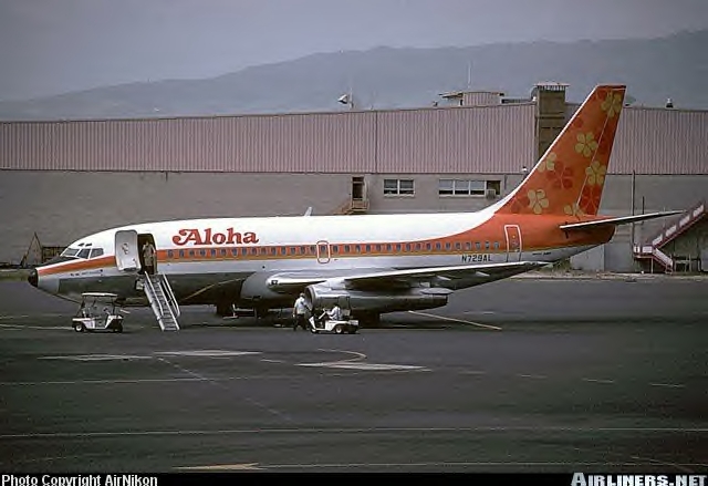 Aloha Airlines Boeing 737-297, N729AL, is shown at Honolulu in January 1983.