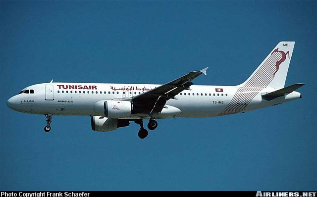 Tunis Air Airbus A320-211, TS-IME, is shown approaching Frankfurt in July 1994.