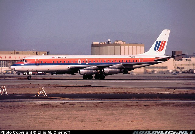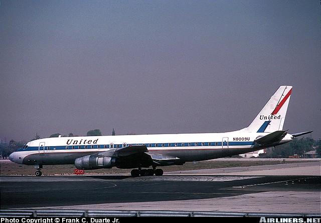 United Airlines Douglas DC-851, N8009U, is shown at Los Angeles in March 1977 wearing the carrier's older livery.