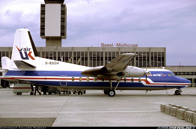 Air UK Fokker F-27-200 Friendship, G-BDDH, is shown at Basle/Mulhouse in July 1980.