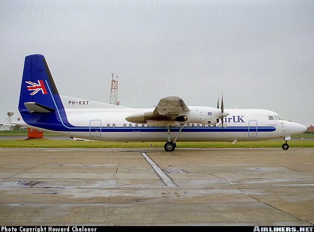 Air UK Fokker 50, PH-KXT, "City of Leeds," is shown at Guernsey in June 1994.