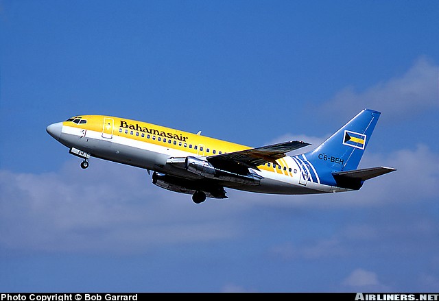 Bahamasair Boeing 737-2V5, C6-BEH, is shown departing Miami International Airport in December 1985.