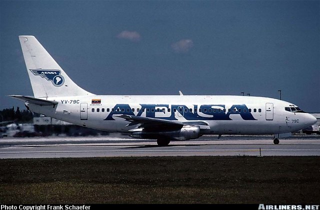Avensa Boeing 737-229, YV-79C, is shown at Miami International Airport in December 1989.
