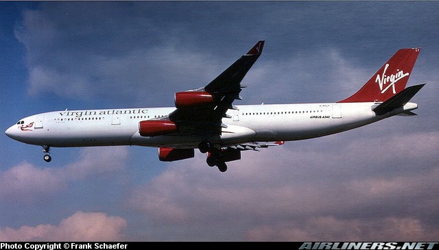 Virgin Atlantic Airbus A340-311, G-VFLY, is shown at London Heathrow in 1996.