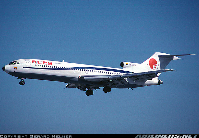 ACES Colombia Boeing 727-227, HK-3738X, is shown approaching Miami International Airport on December 3, 1992.