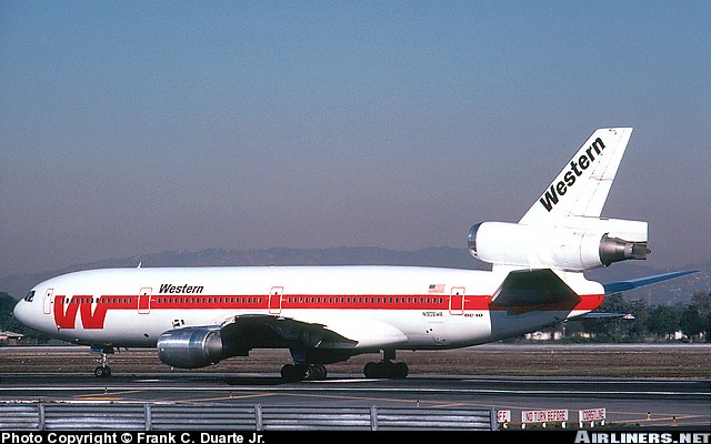 Western Airlines McDonnell Douglas DC-10-10, N909WA, is shown at Los Angeles International Airport in February 1979.