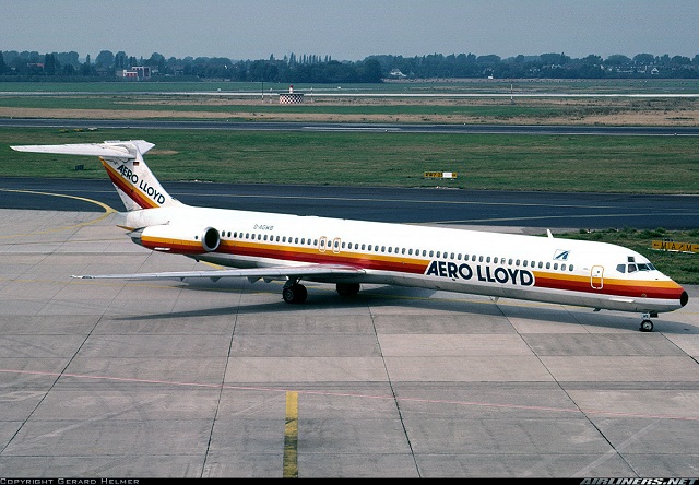 Aero Lloyd McDonnell Douglas MD-83, D-AGWB, is shown at Duesseldorf on April 22, 1992.