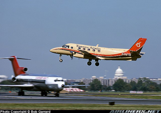 Tenessee Airways Embraer EMB-110P1 Bandeirante, N102TN, is shown departing Washington National Airport in October 1985.