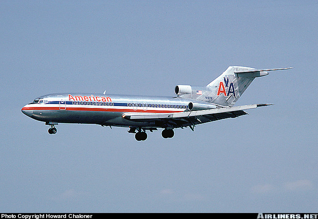 American Airlines Boeing 727-23, N1979, is shown approaching New York LaGuardia Airport on April 29, 1979.