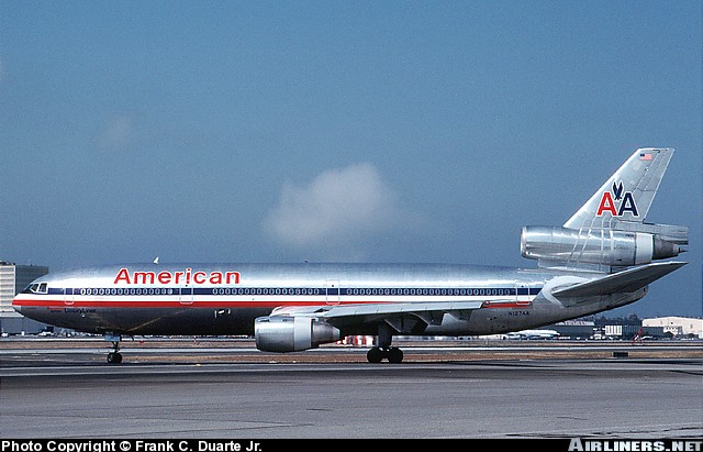 American Airlines McDonnell Douglas DC-10-10, N127AA, is shown at Los Angeles International Airport in July 1984.