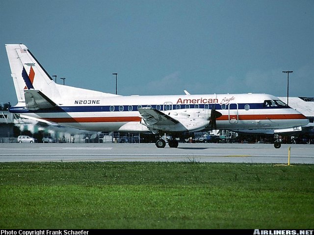 American Eagle Saab 340B, N203NE, is shown at Miami in December 1989.