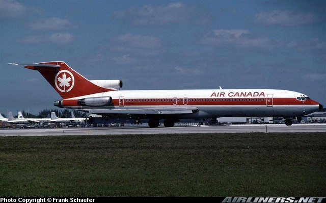 Air Canada Boeing 727-233, C-GAAO, is shown at Miami International Airport in December 1989 wearing updated red