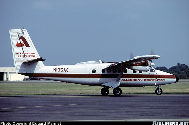 Allegheny Commuter DeHavilland Canada DHC-6-300 Twin Otter, N105AC, is shown at Trenon, New Jersey on August 9, 1983. This Allegheny Commuter flight was operated by Southern Jersey Airways.