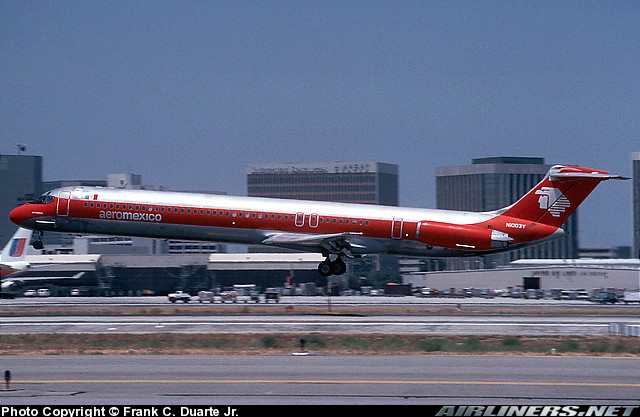 Aeromexico McDonnell Douglas DC-9-82, N1003Y, "Matamoros," is shown arriving at Los Angeles International Airport in