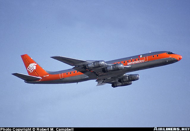 Aeromexico Douglas DC-8-51, XA-SIB, "Jalisco," is shown departing Mexico City in March 1987.
