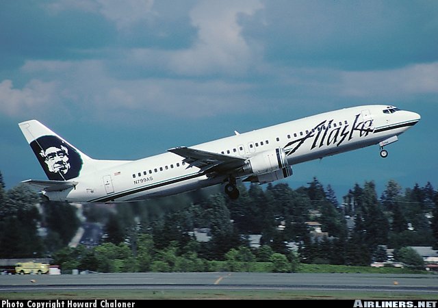 Alaska Airlines Boeing 737-490, N799AS, is shown departing Seattle/Tacoma International Airport on June 5, 1999.