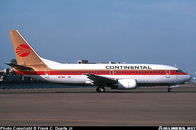 Continental Airlines Boeing 737-3TO, N17316, is shown at San Diego Lindbergh Field in August 1989.