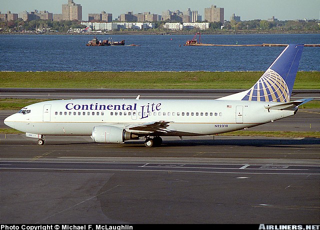 Continental Airlines Boeing 737-3TO, N12318, is shown at LaGuardia Airport in the mid-1990s wearing the livery of the