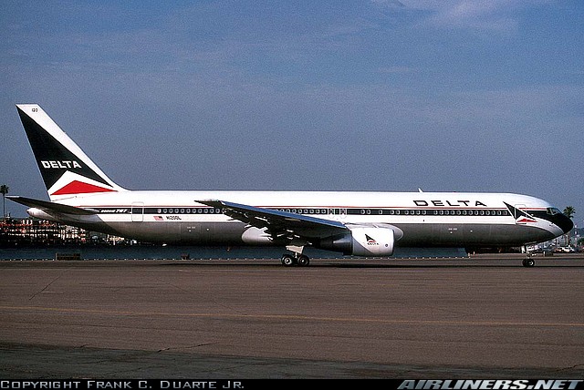 Delta Air Lines Boeing 767-332, N120DL, is shown at San Diego Lindbergh Field in September 1989.
