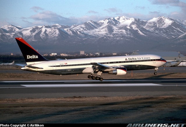 Delta Air Lines Boeing 767-332, N143DA, is shown at Anchorage International Airport in May 1999 wearing the carrier's