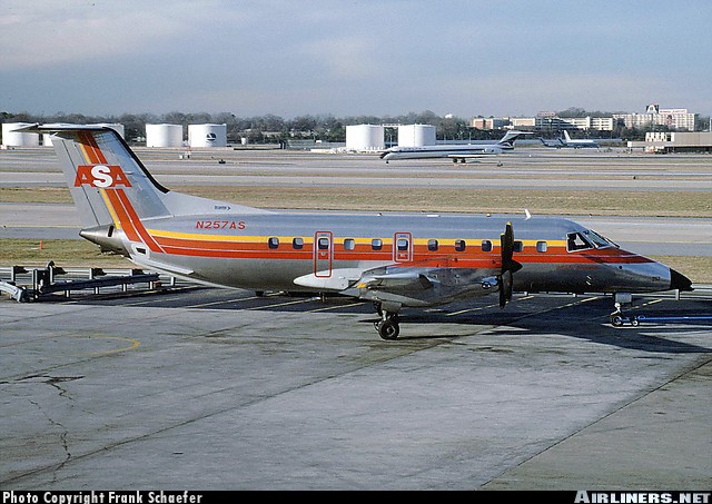 Atlantic Southeast Airlines Embraer EMB-120, N257AS, is shown at Atlanta in March 1993.