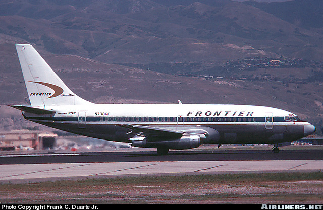 Frontier Airlines Boeing 737-214, N7386F, is shown at Salt Lake City in July 1977 wearing the carrier's older livery.