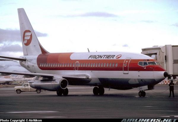 Frontier Airlines Boeing 737-291, N7353F, is shown at Boise Air Terminal in February 1986 wearing the carrier's
