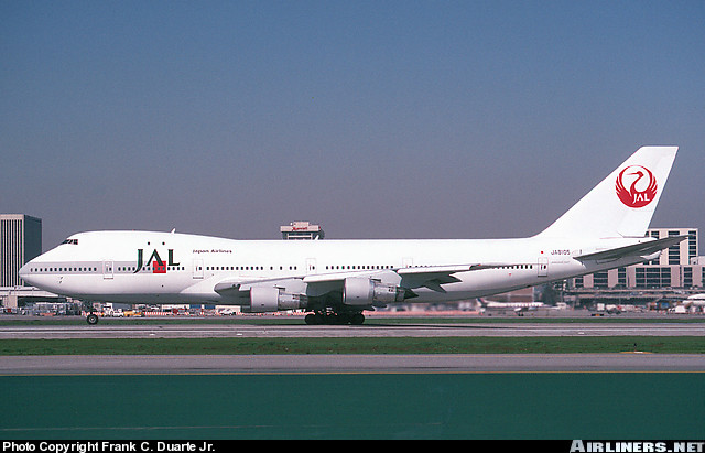 Japan Airlines Boeing 747-246B, JA8105, is shown at Los Angeles International Airport in March 1993.