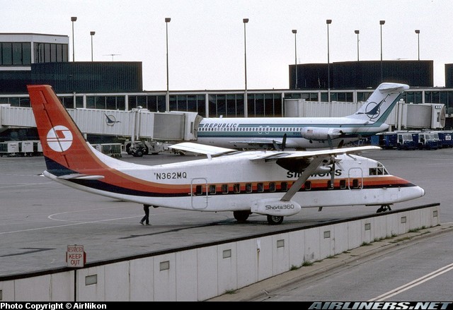 Simmons Airlines Shorts 360, N362MQ, is shown at Chicago O'Hare International Airport in August 1985.