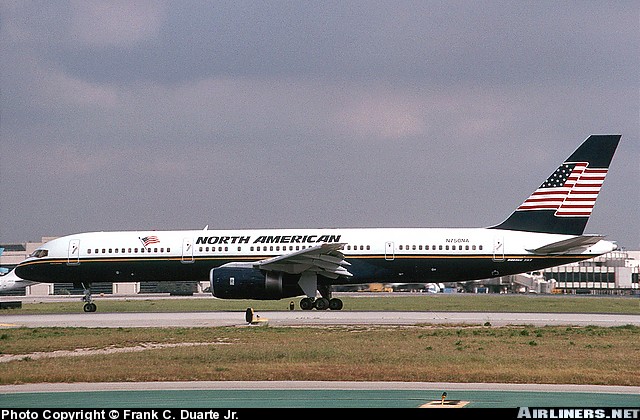 North American Airlines Boeing 757-28A, N750NA, "Lisa Caroline," is shown at Los Angeles International Airport