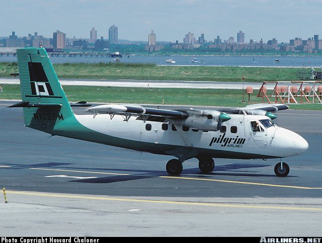 Pilgrim Airlines DeHavilland Canada DHC-6-100, N122PM, is shown at New York LaGuardia Airport on June 13, 1979.