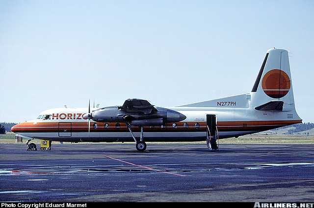 Horizon Air Fairchild F-27A, N277PH, is shown at Spokane, Washington on August 28, 1983.