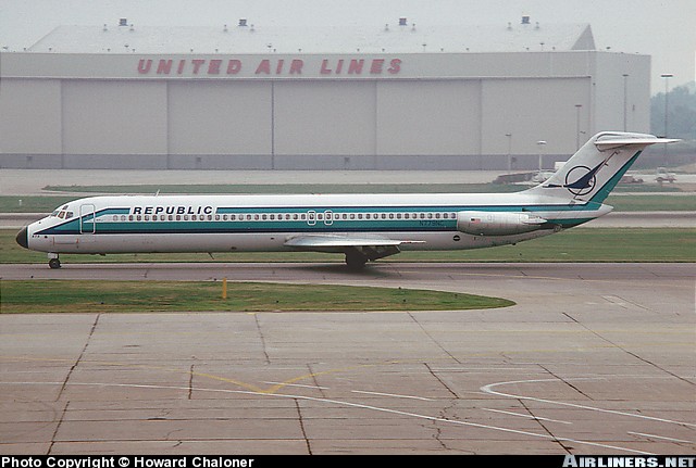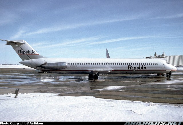 Wearing the final Republic Airlines livery prior to merging with Northwest Airlines, McDonnell Douglas DC-9-51,