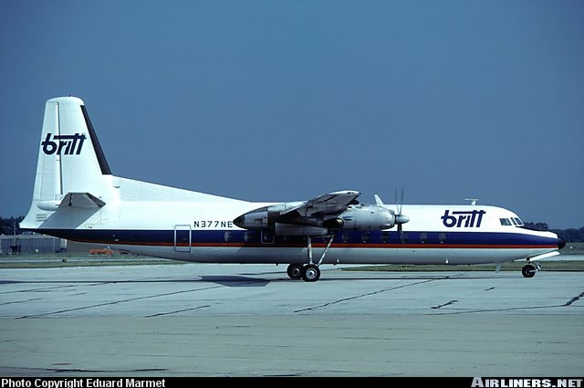 Britt Airways Fairchld-Hiller FH227, N377NE, is shown at South Bend, Indiana on August 18, 1983.