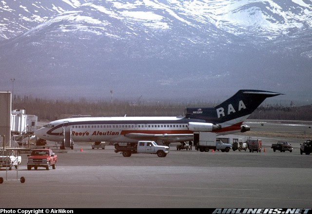 Reeve Aleutian Airways Boeing 727-22C, N832RV, is shown at Anchorage in May 1999.