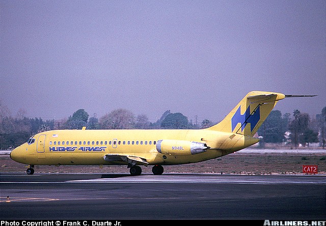 Hughes Airwest McDonnell Douglas DC-9-14, N948L, is shown at Los Angeles International Airport in March 1977.