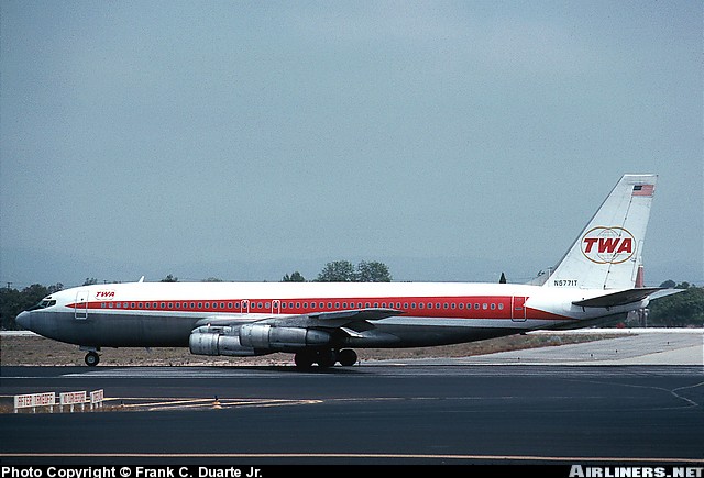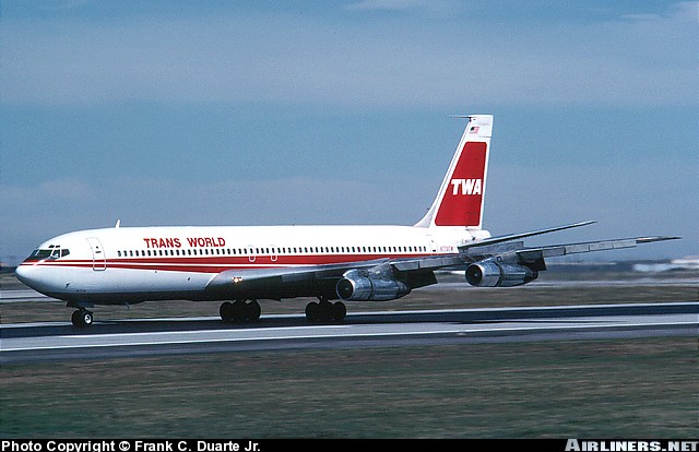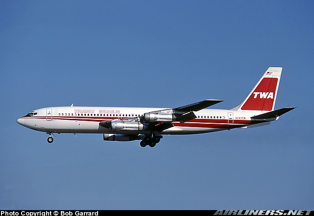 Trans World Airlines Boeing 707-131B, N747TW, is shown wearing the carrier's updated 1974 livery with hollow