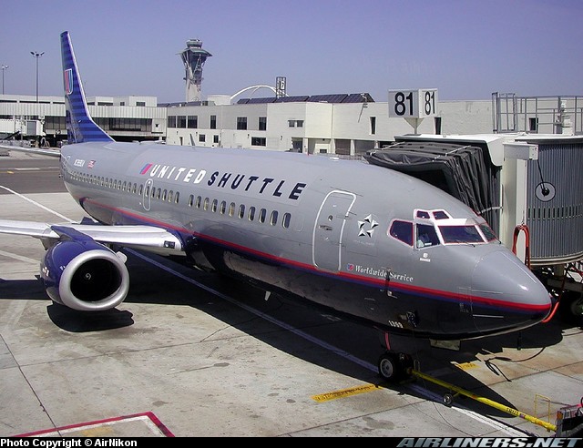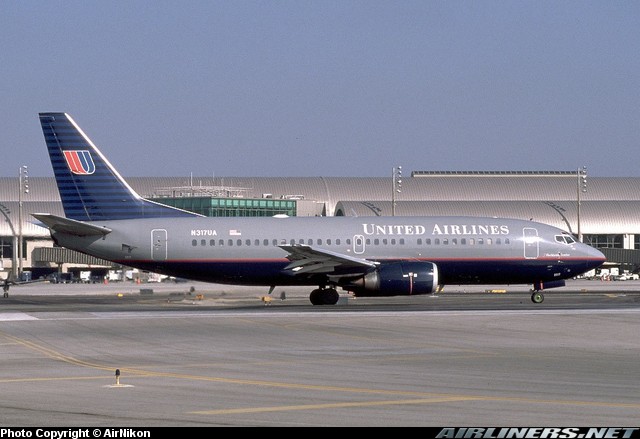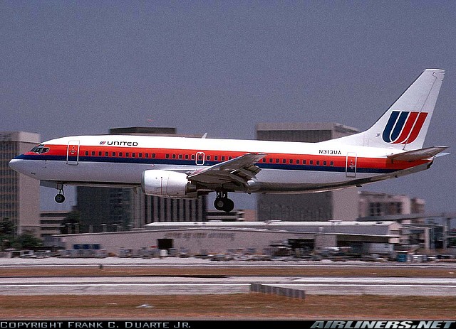 United Airlines Boeing 737-322, N313UA, is shown arriving at Los Angeles in August 1989.