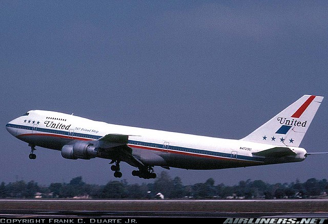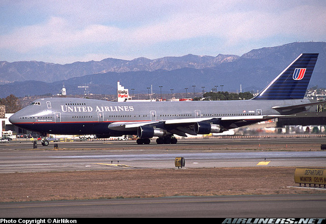 United Airlines Boeing 747-122, N4728U, is shown wearing the carrier's 1993 livery at Los Angeles International Airport