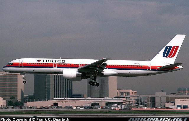 United Airlines Boeing 757-222, N522UA, is shown arriving at Los Angeles in August 1982.